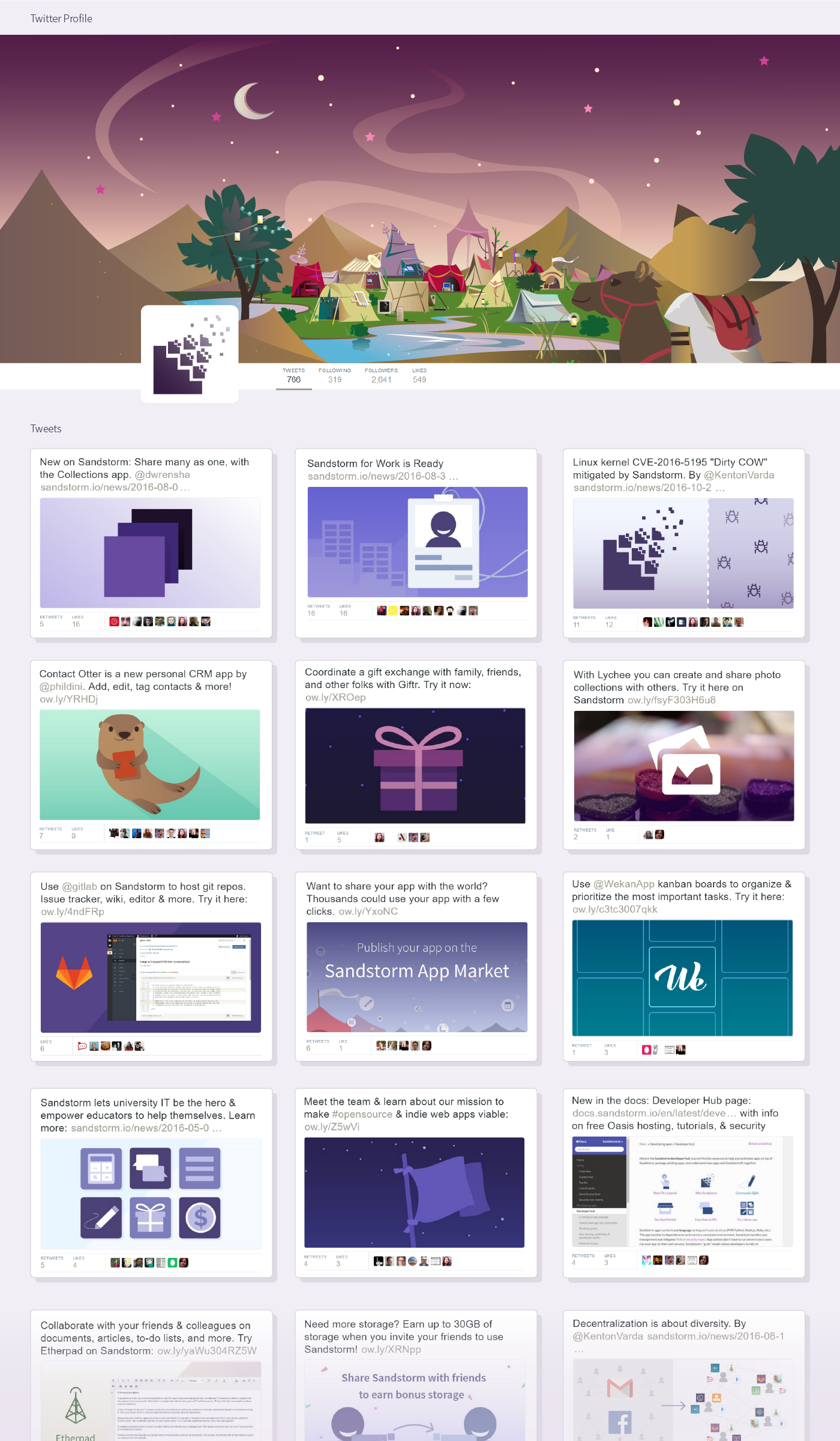 Illustrated feature banner and designer 40+ social media graphics for Sandstorm.io